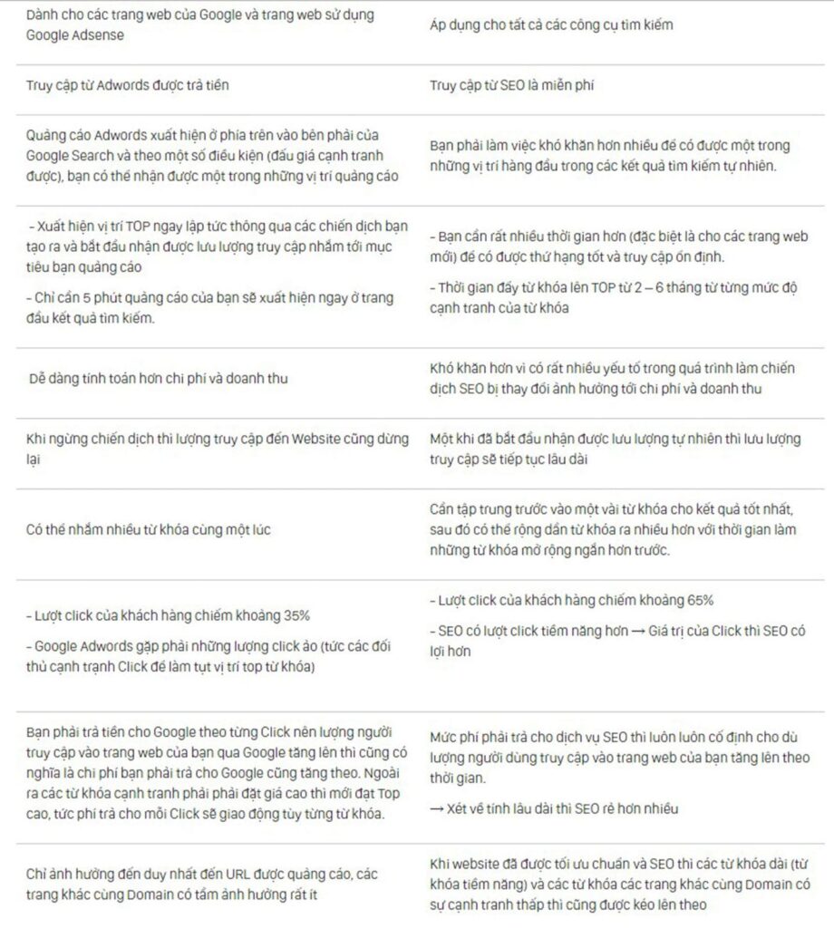 - Google AdWords cung cấp tính linh hoạt trong việc thích nghi với biến đổi thị trường, tiếp cận đối tượng truy cập khác nhau hoặc tìm kiếm dựa trên tin tức và sự kiện mới. Trong khi đó, với SEO, bạn cần có hiểu biết sâu về các công cụ tìm kiếm và phải thích ứng chậm chạp với các thay đổi.